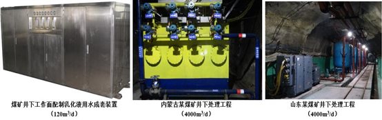中国煤科杭州研究院已完成国内山东、内蒙、安徽、山西等五十多个煤矿的矿井水井下处理和利用工程。实现了煤矿矿井水井下处理后用于防尘洒水、配制乳化液用水等,解决了井下管道、防尘喷嘴、电液阀等设备腐蚀、结垢、堵塞等问题,特别是解决了乳化液用水氯离子和硫酸盐超标的难题,提高了支护系统的安全性和稳定性。